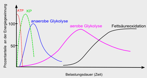 Prinzipiell muss der Körper ATP aufspalten (in Adenosin und drei Phosphatreste), um Energie freizusetzen. Je nach Belastung greift er auf unterschiedliche Energiegewinnungssysteme zurück – je nachdem, wie schnell Energie gebraucht wird (Energieflussrate = die Menge der gewonnene Energie pro Zeiteinheit). Kurze, intensive Belastungen nutzen vor allem KP und ATP. Längere, moderate Belastungen setzen stärker auf Kohlenhydrate (Glykogen) und Fette (Triglyceride).