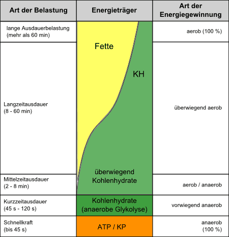 Dein Körper zieht Energie aus zwei Quellen: der Luft, die du einatmest, und der Nahrung, die du ihm gibst. Die Hauptenergieträger aus der Nahrung sind Kohlenhydrate und Fette. Über verschiedene chemische Prozesse entstehen daraus die eigentlichen Energieträger: Adenosintriphosphat (ATP) und zusätzlich energiereiches Kreatinphosphat (KP).